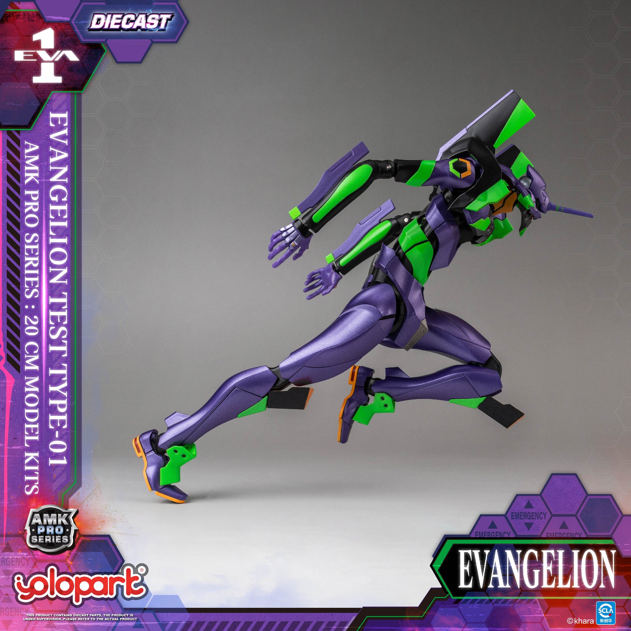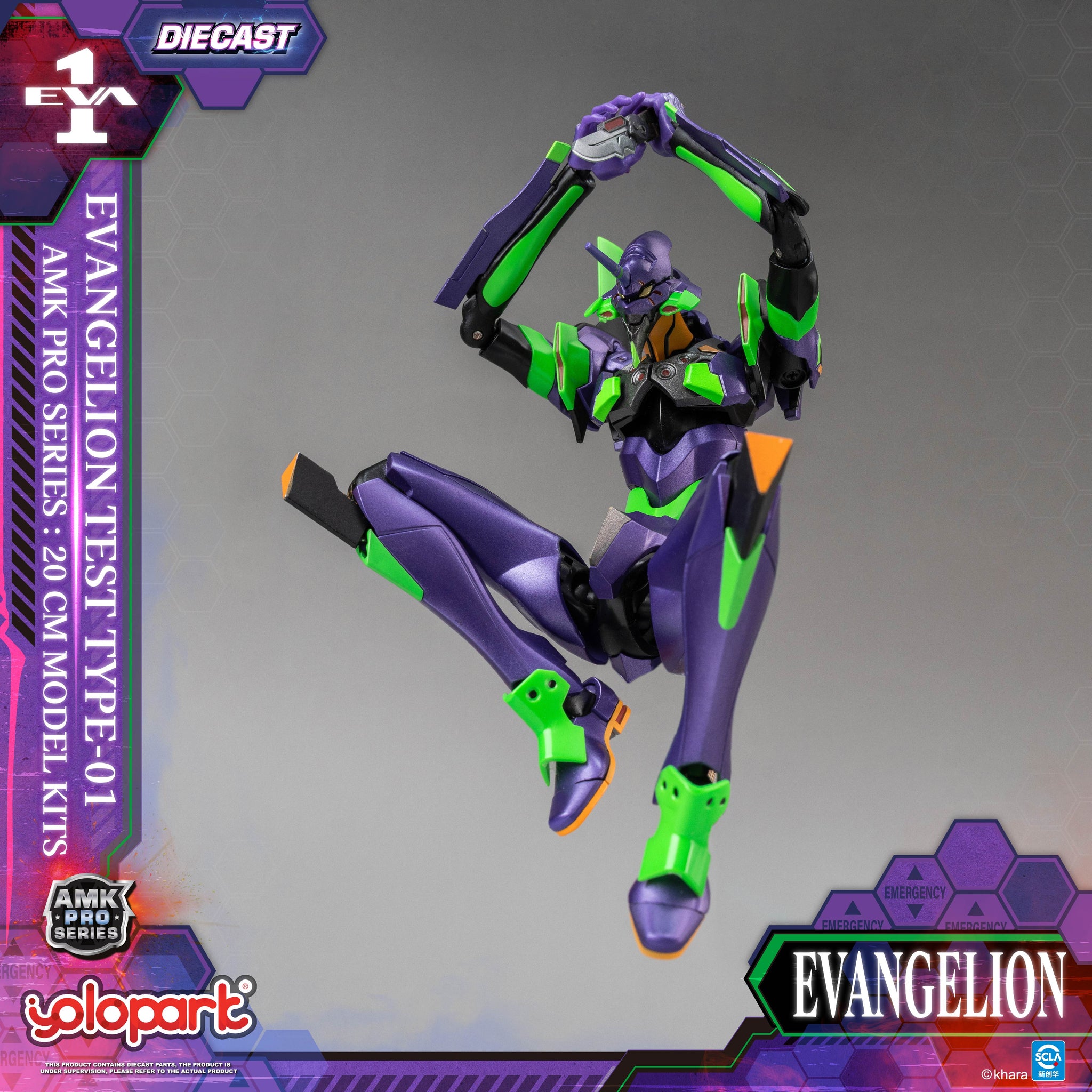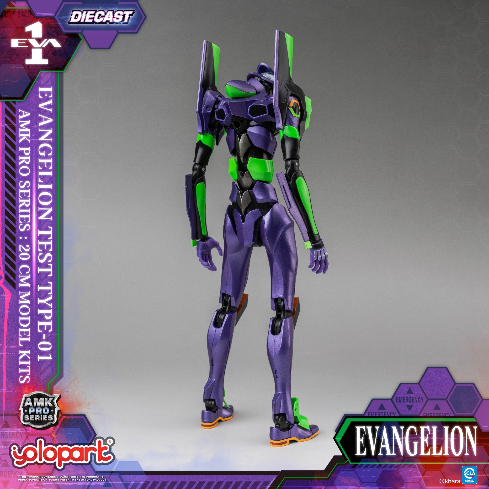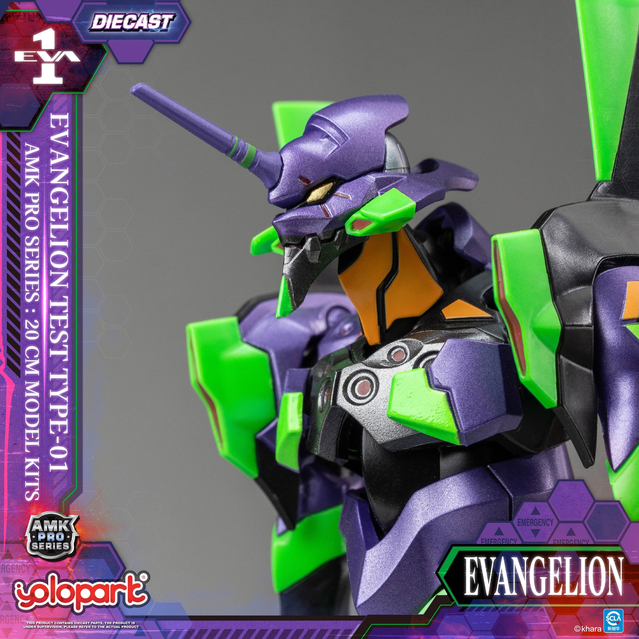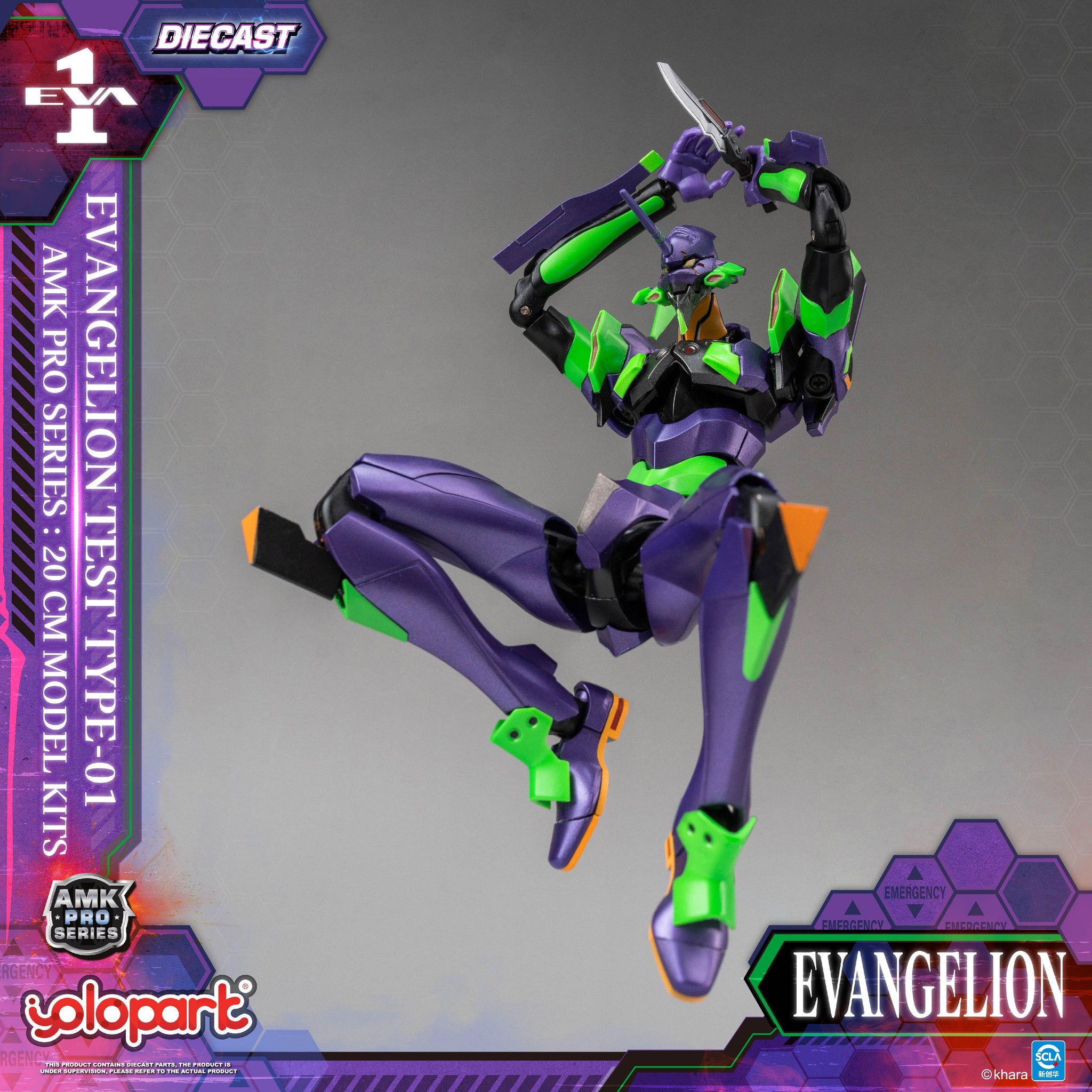 【Product Information】 Product Name: AMK PRO Series EVA-01 TEST TYPE Model Kit Product Material: PVC, ABS, POM, and Die-cast Product Size: Approx. L4.5 × W5 × H20 Product Contents: - Eva Unit-01 main figure ×1 - Launchpad & transport base ×1 - The Spear of Longinus ×1 - Pallet Rifle ×1 - EM-226 440mm Gatling Gun ×1 - Progressive Knife ×2 - battle-damaged interchangeable head ×1 - interchangeable hands ×3 pair